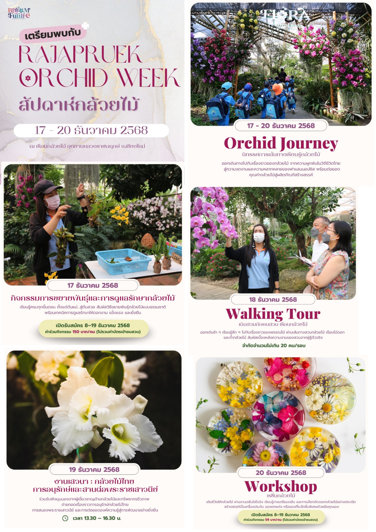 ร่วมเปิดประสบการณ์ใหม่กับความงดงามของ “กล้วยไม้” ในสัปดาห์พิเศษ Rajapruek Orchid Week พบการจัดแสดงกล้วยไม้หลากหลายสายพันธุ์ พร้อมกิจกรรมด้านความรู้ งานสร้างสรรค์ และกิจกรรมเชิงอนุรักษ์ตลอดทั้งสัปดาห์ อาทิ