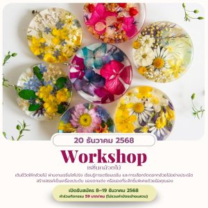 • วันเสาร์ที่ 20 ธันวาคม 2568Workshop “เรซิ่นดอกกล้วยไม้”สนุกกับการสร้างสรรค์งานทำมือ แปลงความงามของดอกกล้วยไม้ให้เป็นชิ้นงานเรซิ่นใส สุดประณีตและไม่ซ้ำใคร.